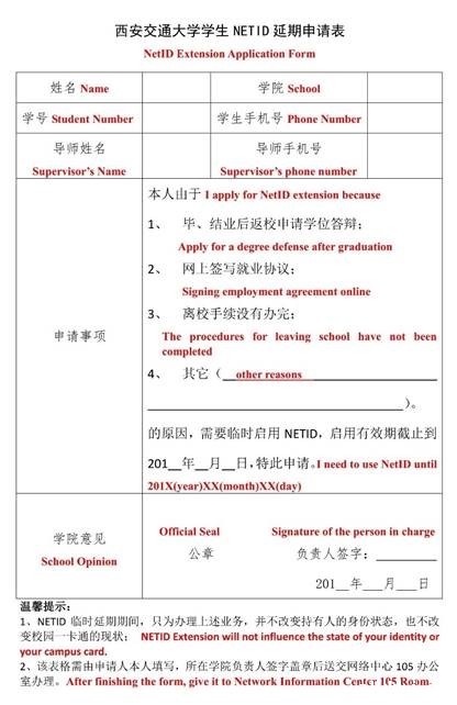 (1). Please visit //www.zlykkj.com and choose “下载空间(Download Space)” →“校内下载(Campus Download)”→“申请表格(Application Form)”→Download “学生NetID延期申请表格(Student NETID Extension Application Form)”, and then you should fill in the form according to the requirements and ask the relevant person to stamp on the form.