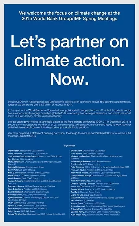 这43位企业领导人深信,私营部门必须在全球范围内采取行动,以减少温室气体排放并推动向深度低碳经济的转型;呼吁在巴黎(会议上)签订雄心勃勃的、与联合国可持续发展目标相匹配的协议。这一由企业届与各国政府,民间团体和学术界联合采取的大规模联合行动是唯一能够发掘思路,理念和新模式的手段,以应对全球所面临的首要问题。