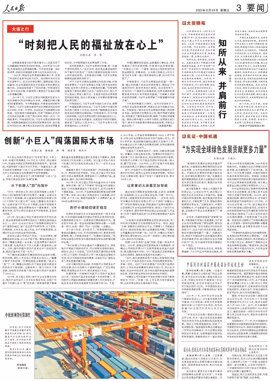 《人民日报》“为实现全球绿色发展贡献更多力量(见证·中国机遇)”,2022年08月24日03版